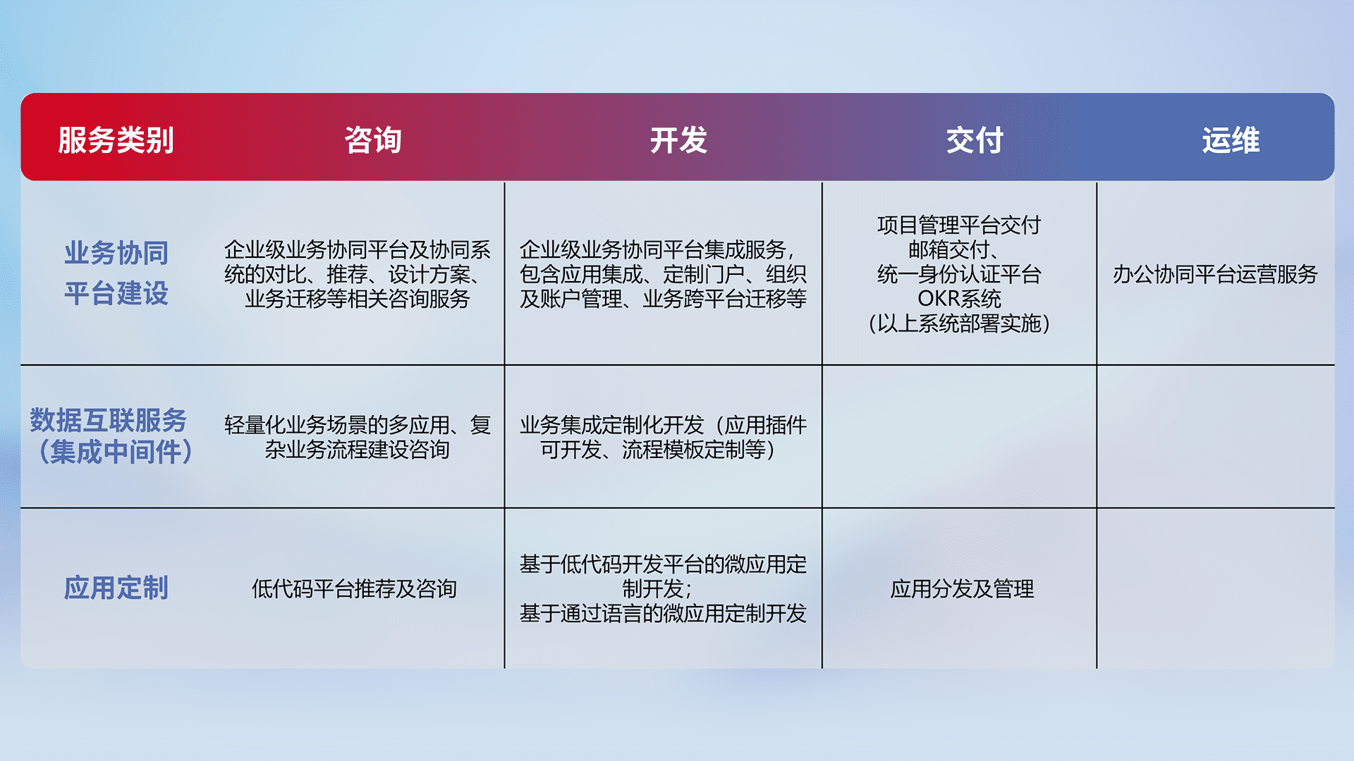 针对钉钉、、、企微、、、、IDaas等平台级产品提供产品的规划、、方案、、交付、、、、定制化开发等服务,,实现如统一协同办公、、智能客户服务、、、、混合会议管理、、、智能数据查询、、、、等业务场景,,,,实现数字化转型。。